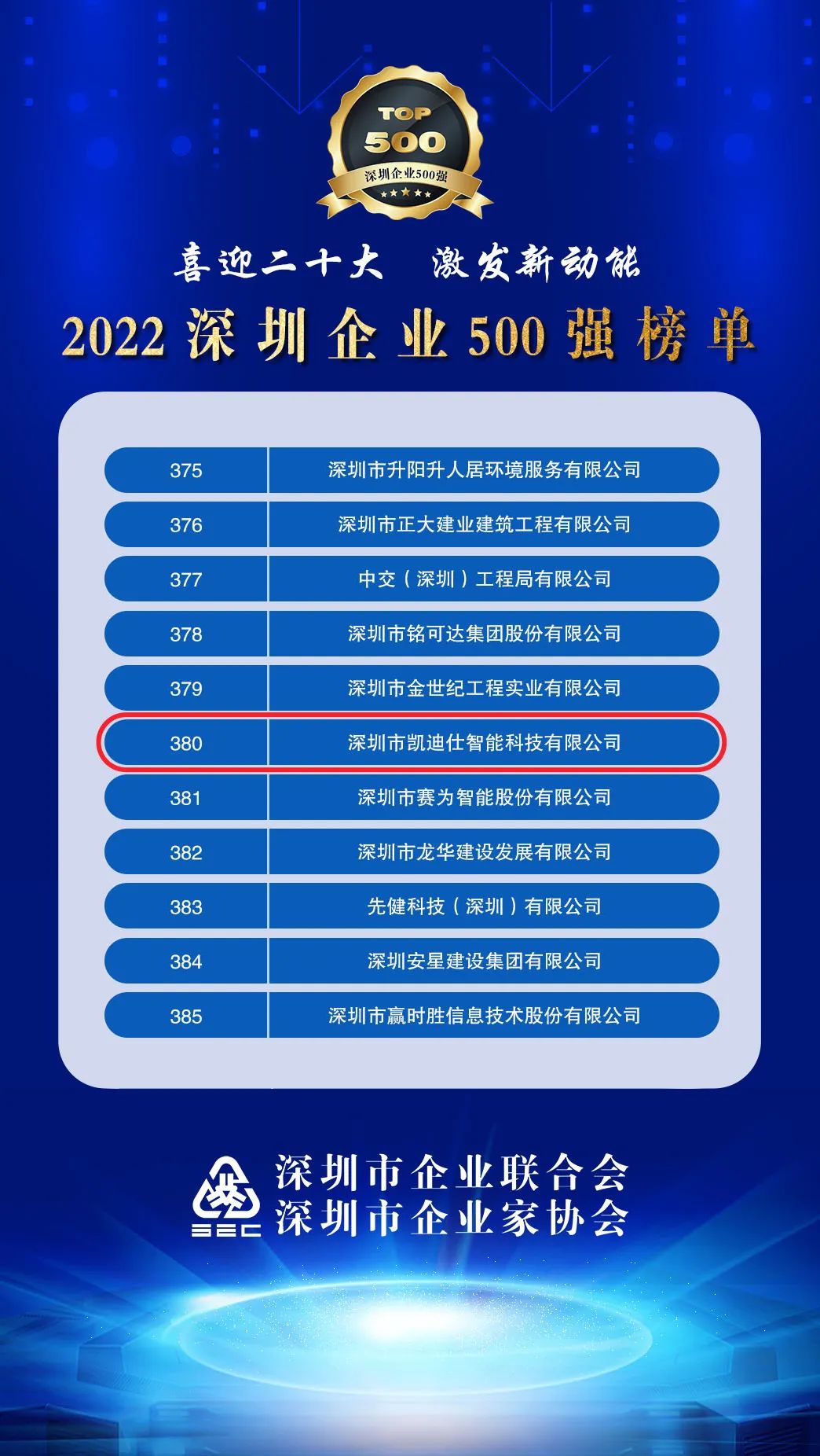 重(zhong)磅!Kaadas凱迪仕榮登2022深圳500強齊(qi)業榜單(dan),位列500強榜單(dan)第380位