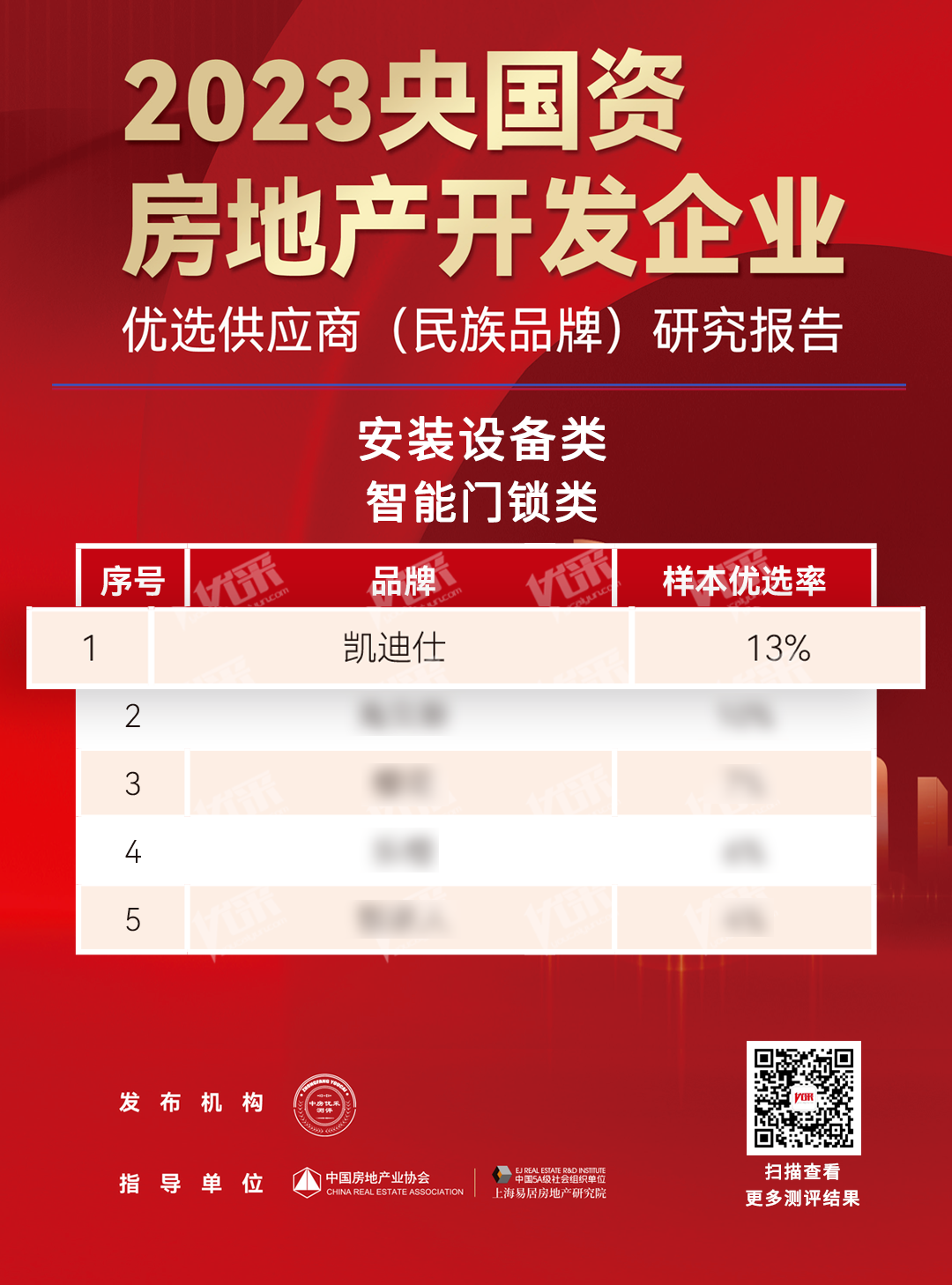 凱迪仕通(tong)過(guo)層層審核,多(duo)維(wei)度展(zhan)現(xian)了(le)頭部(bu)品(pin)牌的(de)實力(li),以(yi)13%的(de)樣本(ben)優(you)選率,在(zai)安(an)裝(zhuang)設(shè)備(bei)類智能(néng)們(men)鎖類排(pai)名(míng)第一(yi)。
